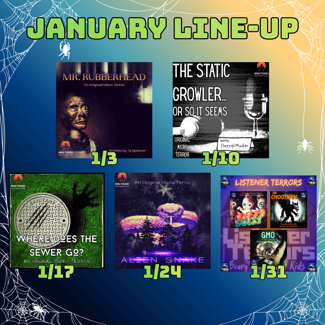 JANUARY 2026 LINE-UP: 1/3 - MR. RUBBERHEAD ... 1/10 - THE STATIC GROWLER ...OR SO IT SEEMS ... 1/17 - WHERE DOES THE SEWER GO? ... 1/24 - THE ALIEN SNAKE ... 1/31 - LISTENER TERRORS